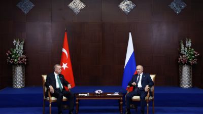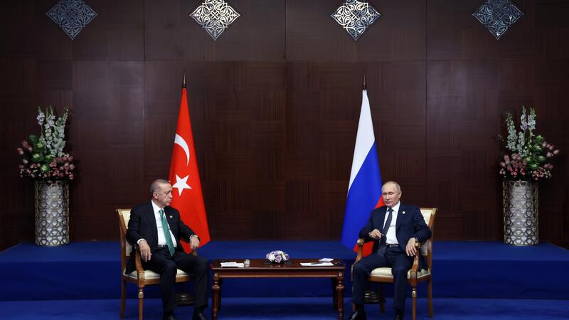 Russian President Vladimir Putin meets with Turkey's President Recep Tayyip Erdogan on the sidelines of the Sixth Summit of the Conference on Interaction and Confidence Building Measures in Asia (CICA) in Astana on October 13, 2022. (Photo by Vyacheslav PROKOFYEV / SPUTNIK / AFP)