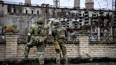 In this picture taken on April 13, 2022, Russian soldiers stand guard at the Luhansk power plant in the town of Shchastya. *EDITOR'S NOTE: This picture was taken during a trip organized by the Russian military.* (Photo by Alexander NEMENOV / AFP)
