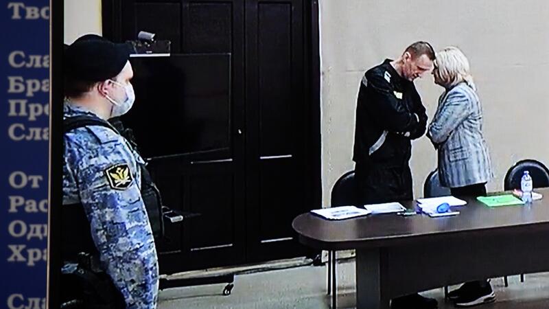 Russian opposition leader Alexei Navalny and lawyer Olga Mikhailova are seen on a screen via a video link during the verdict in Navalny's embezzlement and contempt of court trial at the IK-2 prison colony in the town of Pokrov in Vladimir Region on March 22, 2022. (Photo by AFP)