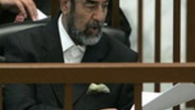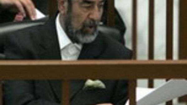 Saddam sat in the dock with his six co-defendants as the court convened inside Baghdad's fortified Green Zone.