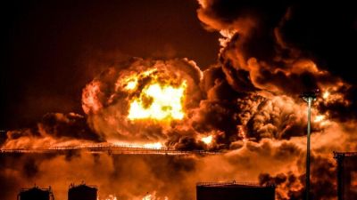 Smoke and flames rise from a Saudi Aramco oil facility in Saudi Arabia's Red Sea coastal city of Jeddah, on March 25, 2022, following a reported Yemeni rebels attack. Yemeni rebels said they attacked a Saudi Aramco oil facility in Jeddah as part of a wave of drone and missile assaults today as a huge cloud of smoke was seen near the Formula One venue in the city. (Photo by AFP)