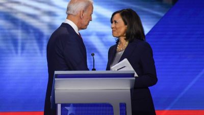 Former Vice President Joe Biden and Senator Kamala Harris speak on September 12, 2019, in Houston, Texas, after the third Democratic primary debate of the 2020 presidential campaign season hosted by ABC News. (Robyn Beck / AFP)