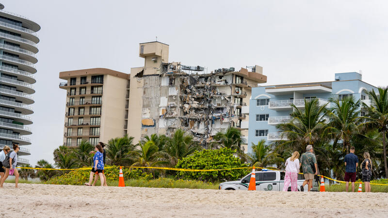 Television images showed a mass of rubble and wooden beams in a large empty space where the building once stood, with neighbouring buildings charred and damaged.