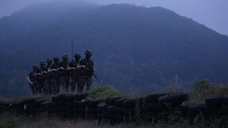 South Korean marines patrol on the South Korea-controlled island of Yeonpyeong near the 'northern limit line' sea boundary with North Korea on June 17, 2020. North Korea threatened June 17 to bolster its military presence in and around the Demilitarized Zone, a day after blowing up its liaison office with the South, prompting sharp criticism from Seoul. YONHAP / AFP