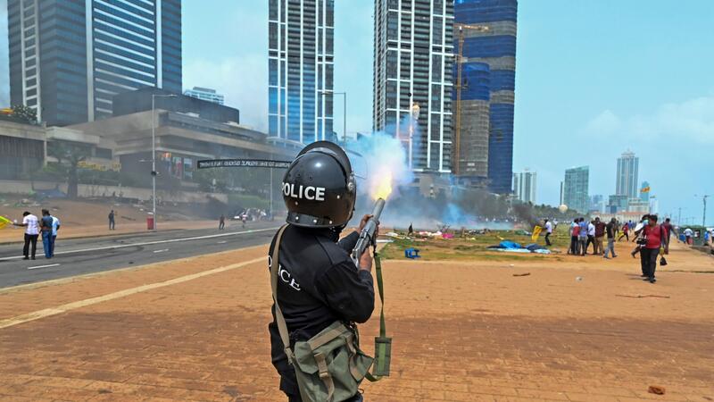 A policeman fires tear gas during a clash between government supporters and demonstrators outside the President's office in Colombo on May 9, 2022. (Photo by Ishara S. KODIKARA / AFP)