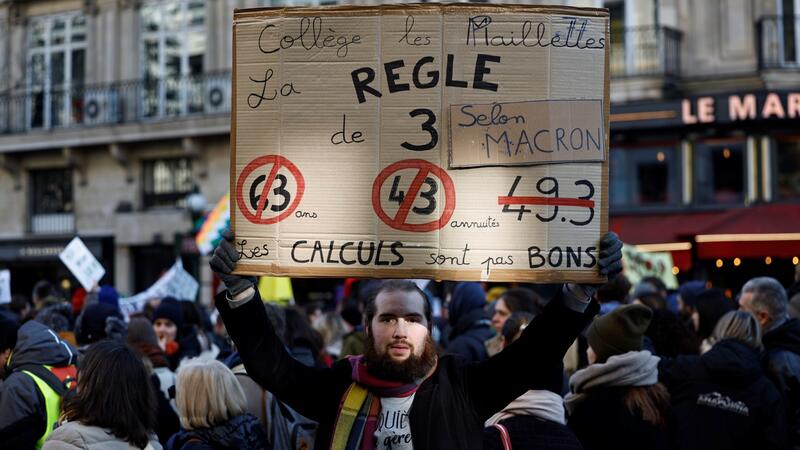 A protester holds a placard prior to the start of the demonstration, on the third day of nationwide rallies organised since the start of the year, against a deeply unpopular pensions overhaul near Place de l'Opera in Paris on February 7, 2023. (Photo by Sameer Al-Doumy / AFP)