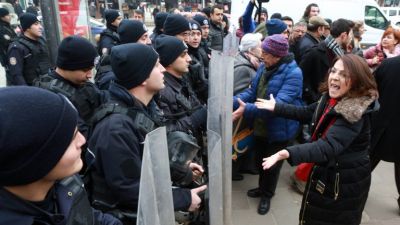 University students and academics face Turkish riot policemen during a protest outside a university campus in Ankara on February 10, 2017, against the dismissal of academics from universities following a post-coup emergency decree. (AFP/Adem Altan)