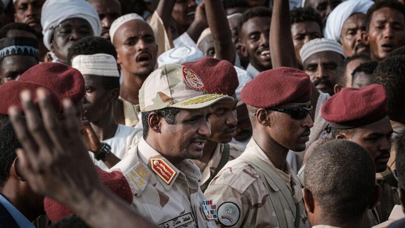 Mohamed Hamdan Dagalo, known as Himediti, deputy head of Sudan's ruling Transitional Military Council (TMC) and commander of the Rapid Support Forces (RSF) paramilitaries, arrives to give a speech during a rally in the village of Abraq, about 60 kilometers northwest of Khartoum, on June 22, 2019. (Yasuyoshi CHIBA / AFP)