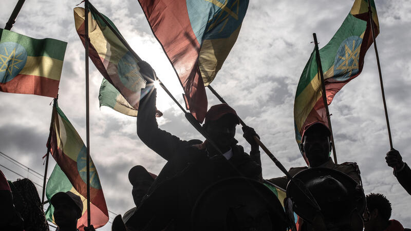 Protesters wave Ethiopian flags during a rally against pro-TPLF forces (Tigray People's Liberation Front) and to support for Ethiopia's armed forces in Addis Ababa on August 08, 2021. (Photo by Amanuel Sileshi / AFP)