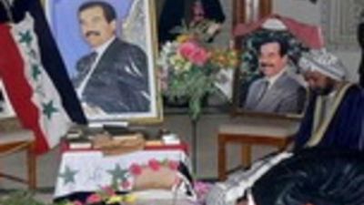One such poster of Saddam was inscribed with the words "Hero and Martyr Saddam Hussein".