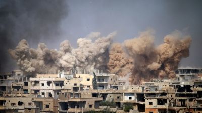 Smoke rises from buildings following a reported air strike on a rebel-held area in the southern Syrian city of Daraa, on June 14, 2017. (Mohamad Abazeed/AFP)