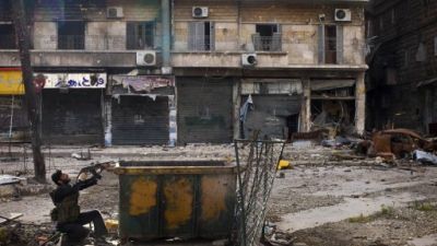 A Syrian rebel aims his weapon as he takes position behind a makeshift barricade during clashes with regime forces in the Salaheddine district of Aleppo in northern Syria on Saturday. (Photo: AFP / JM LOPEZ)