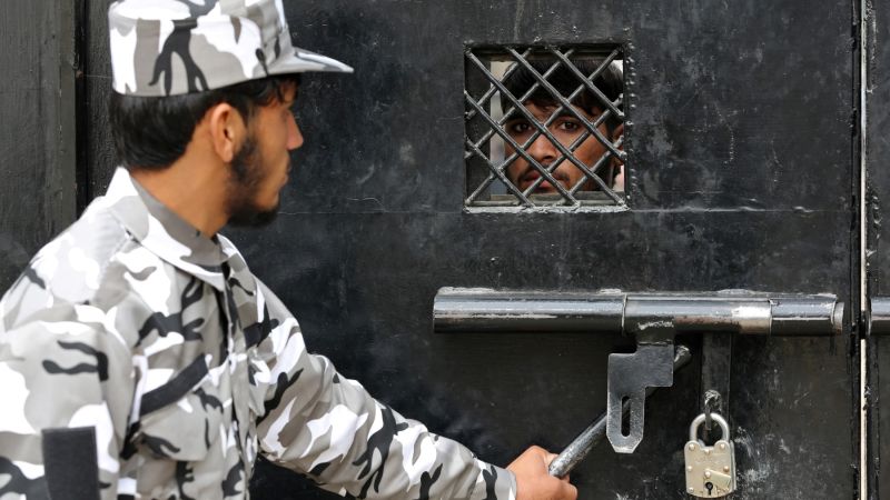 A member of Taliban security force stands guard as an inmate watches from behind the closed gate of a prison in Jalalabad on January 19, 2023. (Photo by Shafiullah KAKAR / AFP)