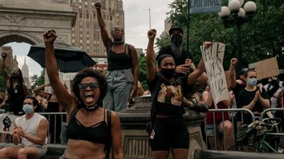 Demonstrators denouncing systemic racism and the police killings of black Americans rally in Washington Square Park in the borough of Manhattan on June 6, 2020 in New York City. This is the 12th day of protests since George Floyd died in Minneapolis police custody on May 25. Scott Heins/Getty Images/AFP Scott Heins / GETTY IMAGES NORTH AMERICA / Getty Images via AFP