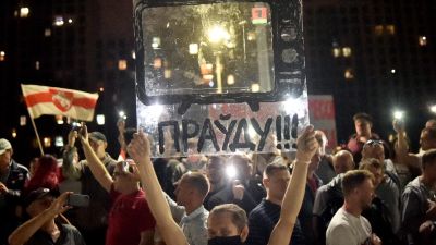 A Belarus opposition supporter holds a fiberglass sheet with a drawn TV and an inscription reading "The truth!!!" near the State TV and radio company during a protest rally against police violence recent rallies of opposition supporters, who accuse strongman Alexander Lukashenko of falsifying the polls in the presidential election, in central Minsk, late on August 15, 2020. Sergei GAPON / AFP
