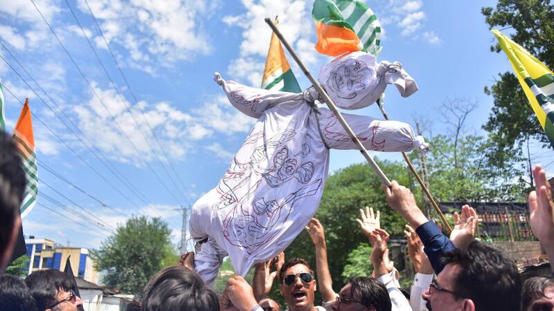 Pakistani Kashmiri hold an effigy of Indian Prime Minister Narendra Modi during a protest in Muzaffarabad, the capital of Pakistan-controlled Kashmir, on August 8, 2019.