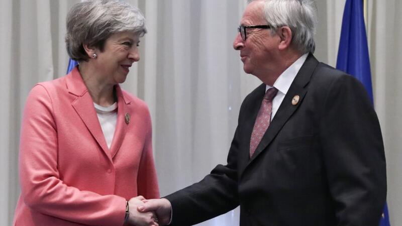 Britain's Prime Minister Theresa May (L) greets the European Commission President Jean-Claude Juncker during a meeting on the sidelines of the the first joint European Union and Arab League summit. (AFP/ File)