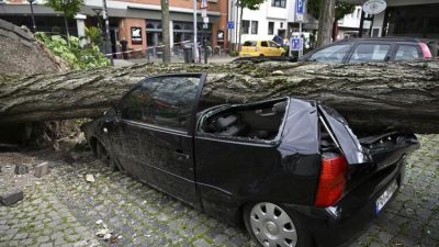 The trunk of an uprooted tree lies on a destroyed car in the city centre of Paderborn, western Germany on May 21, 2022, the day after a storm caused major damage. Almost 40 people were injured, several seriously, on May 20 in a "tornado" which hit the western German city of Paderborn, the police and fire brigade said. A police spokesman said the tornado also caused significant damage in the city in the North Rhine-Westphalia state, following abnormally high temperatures for the time of year. (Photo by INA FASSBENDER / AFP)