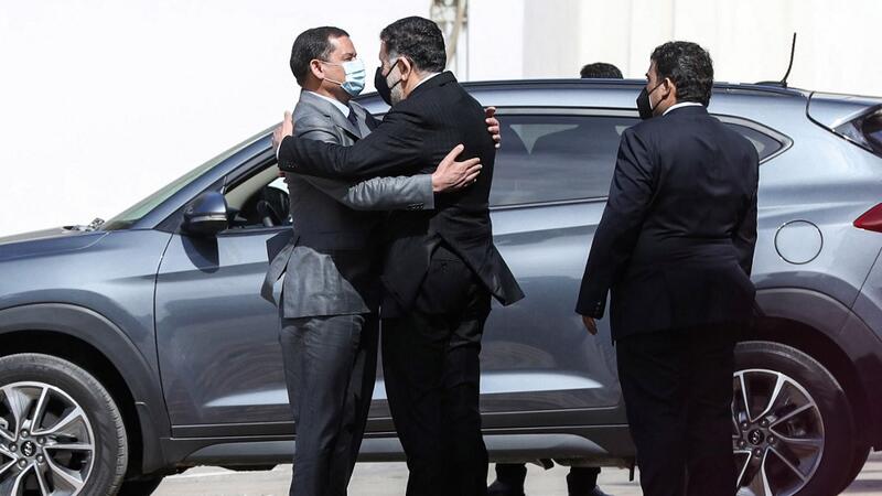 Mohamed al-Manfi (R), head of Libya's presidency council looks on as new interim Prime Minister Abdul Hamid Dbeibah (L) embraces outgoing GNA head Fayez al-Sarraj (C) before the latter's departure during the formal handover at the Presidential Council headquarters in Libya's capital Tripoli on March 16, 2021. Mahmud Turkia / AFP