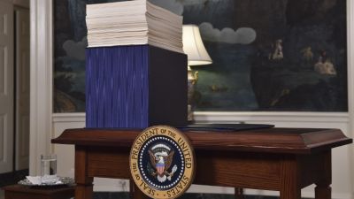 A copy of the spending bill, approved by Congress, is seen on a desk before U.S. President Donald Trump speaks about the bill in the Diplomatic Room at the White House on Mar. 23, 2018.