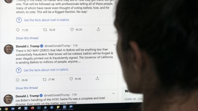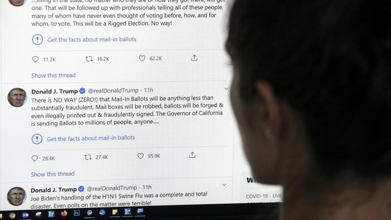 This illustration photo shows an editor in Los Angeles looking at the official Twitter account of US President Donald Trump on May 26, 2020, with two tweets by the president under which Twitter posted a link reading "Get the facts about mail-in ballots". Twitter labelled two of Donald Trump's tweets misleading on May 26, a first for the social media network which has long resisted calls to censure the US President over his frequent abuse, insults and false claims. Trump's tweets contended without evidence t