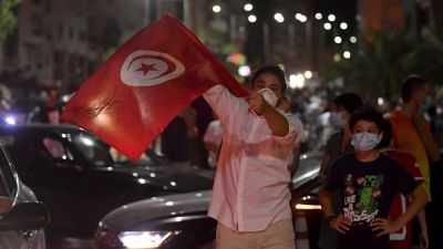 People celebrate in the street after Tunisian President Kais Saied announced the suspension of parliament and the dismissal of the prime minister in Tunis on July 25, 2021, after a day of nationwide protest. FETHI BELAID / AFP