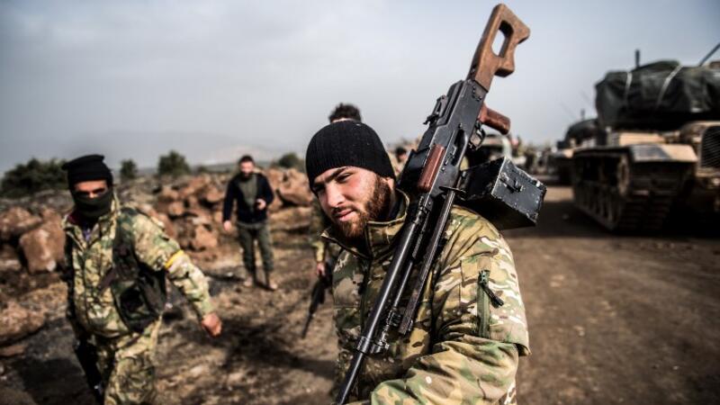 Turkish troops advance near the Syria border at Hassa, Hatay province, on Jan. 22, 2018, as part of the operation "Olive Branch" (BULENT KILIC / AFP)