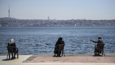 Women wearing protective face masks, sit apart following social distancing measures at the seaside on May 10, 2020, at Kabatas in Istanbul, after a month and a half of lockdown restrictions aimed at stemming the spread of the novel coronavirus, COVID-19. Turkish people aged 65 and over on May 10, 2020, described their joy after the government allowed them to go outside for the first time in nearly two months in an easing of the coronavirus restrictions. While 24 provinces including Ankara and Istanbul are s