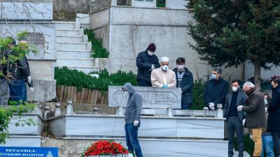People with protective face mask attend the funeral of Istanbul University Faculty of Medicine's doctor Cemil Tascioglu, the country's first medical professional to pass away from the novel coronavirus (COVID-19) disease, on April 2, 2020, in Istanbul.