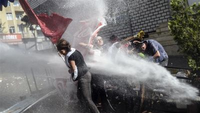 Protesters try to protect themselves as Turkish anti-riot police fire water cannon to disperse crowd. (AFP/File)
