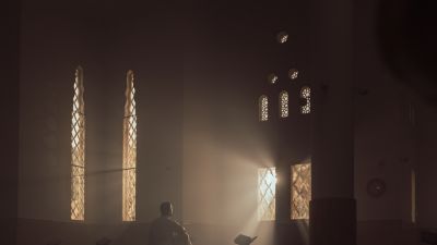 a man in a mosque reads the Qur'an an Arab in a white Kandur Arabic clothing outdoor Qur'an mosque night reading of the Qur'an Ramadan Islam religion Islam. Shuttertock
