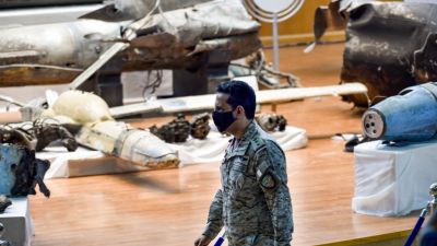 Royal Saudi Air Force Colonel Turki bin Saleh al-Malki walks past alleged Iranian weapons seized by Saudi forces from Yemen's Huthi rebels, ahead of a press conference at the Armed Forces Oficers club in Saudi Arabia's capital Riyadh on July 2, 2020, after air strikes on the rebel-held Yemeni capital. FAYEZ NURELDINE / AFP