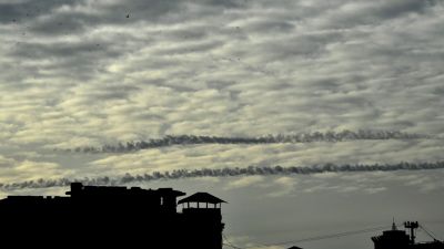 TOPSHOT - Missiles contrails are seen in the sky over Kyiv on December 29, 2022 amid the Russian invasion of Ukraine. A fresh barrage of Russian missile strikes battered Ukraine on December 29, 2022, wounding at least five people including a teenager and cutting electricity in the west. Blasts were reported across the vast country including in the Ukrainian capital, the second city Kharkiv in the east and the western city of Lviv on the border with Poland. (Photo by Sergei SUPINSKY / AFP)