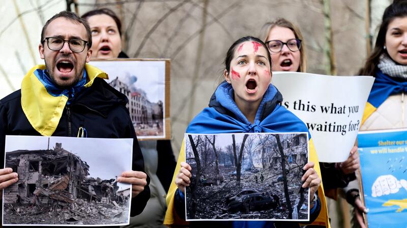 Protesters hold images of the destruction in the Ukrain as the chant during a protest near the German Permanent Representation to the European Union, asking Germany to provide immediate support to Ukraine in the war with Russia, in Brussels on March 11, 2022. (Photo by Kenzo TRIBOUILLARD / AFP)