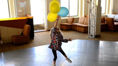 A Ukrainian girl plays with balloons with the colours of her country's flag aboard the Corsica Linea ferry "Mediterranee" in Marseille, southern France, on April 26, 2022. (Photo by Nicolas TUCAT / AFP)