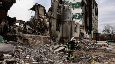 Ukrainian firefighters work in the rubble of a collapsed building in the town of Borodianka, northwest of Kyiv, on April 8, 2022. (Photo by RONALDO SCHEMIDT / AFP)