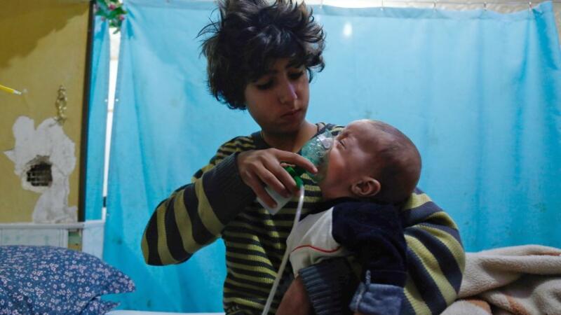 A Syrian boy holds an oxygen mask over the face of an infant at a make-shift hospital following a reported gas attack on the rebel-held besieged town of Douma in the eastern Ghouta region on Jan. 22, 2018 (HASAN MOHAMED / AFP)