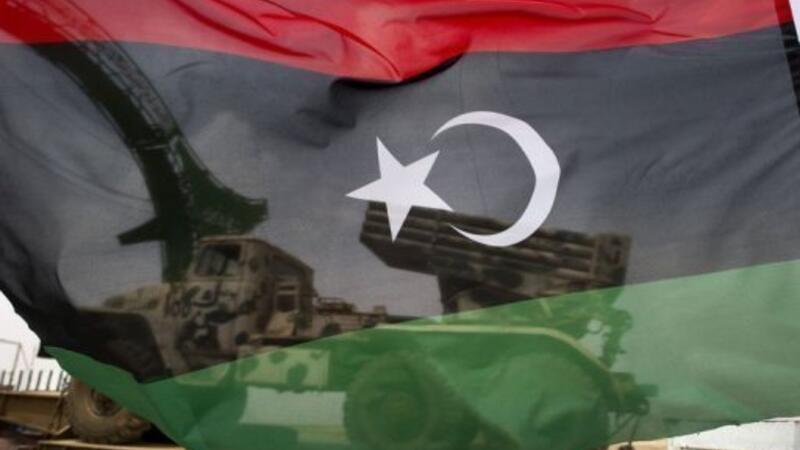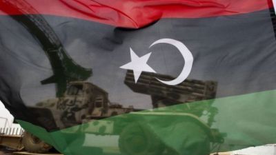 A Libyan flag flown in front of a military vehicle. (AFP/File)