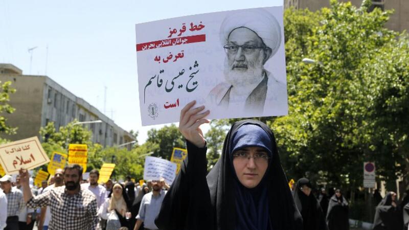 An Iranian protestor holds a banner bearing a portrait of top Bahraini Shiite cleric Isa Qassim, who was sentenced on May 21 to a suspended one-year jail term, during a demonstration in the capital Tehran on May 26, 2017 (STR/AFP)