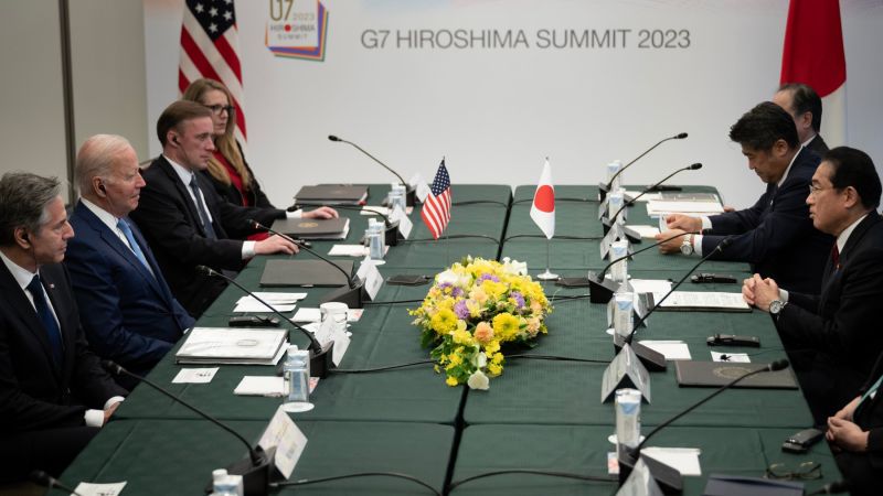 US Secretary of State Antony Blinken (L), US President Joe Biden (2nd-L), National Security Advisor Jake Sullivan (3rd-L) and others listen to Japan's Prime Minister Fumio Kishida (R) during a bilateral meeting in Hiroshima on May 18, 2023, ahead of the G7 Leaders' Summit. (Photo by Brendan Smialowski / AFP)