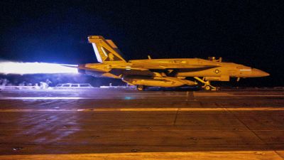 This handout picture taken on January 12, 2024 shows a fighter jet taking off from USS Dwight D. Eisenhower (CVN 69) during flight operations in response to increased Iranian-backed Houthi attacks on ships in the Red Sea. (Photo by Zachary Elmore / US NAVY / AFP)