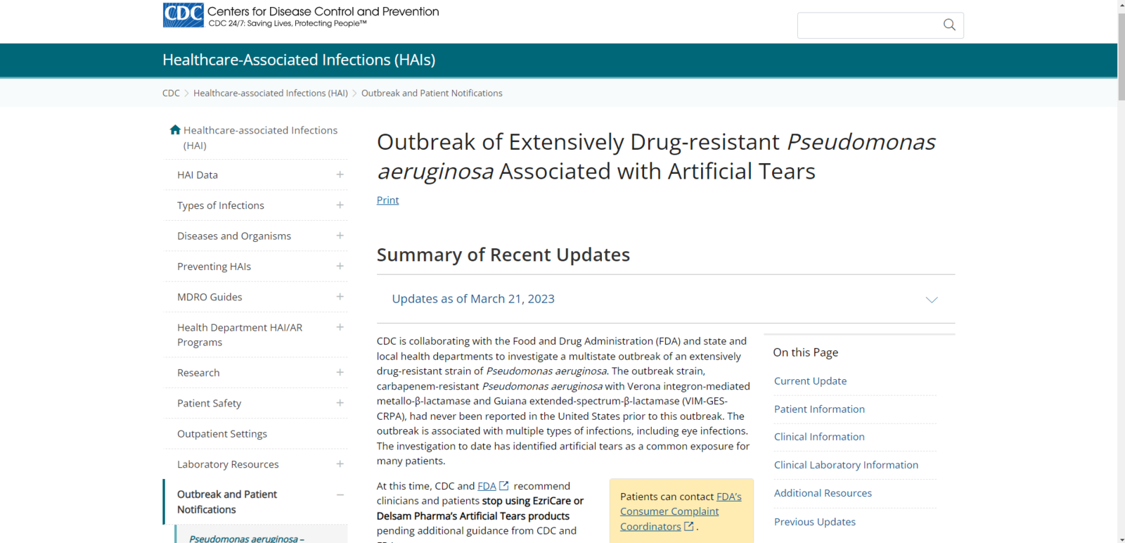 The CDC and the U.S. Food and Drug Administration (FDA) have been warning patients in the past few months to stop using EzriCare or Delsam Pharma’s Artificial Tears products.