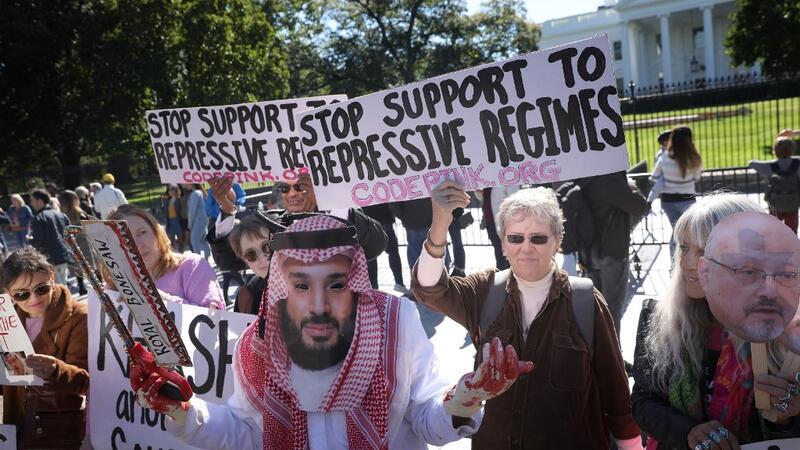 A protester dressed as Saudi Arabian crown prince Mohammad bin Salman, demonstrates with members of the group Code Pink outside the White House in the wake of the disappearance of Saudi Arabian journalist Jamal Khashoggi October 19, 2018 in Washington, DC. Khashoggi has disappeared following a meeting at the Saudi consulate in Istanbul on October 2, 2018. Win McNamee/Getty Images/AFP WIN MCNAMEE / GETTY IMAGES NORTH AMERICA / AFP
