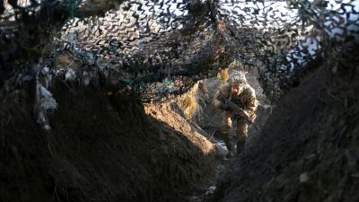 Ukrainian Territorial Defense Forces, the military reserve of the Ukrainian Armes Forces walks on a trench on the frontline with Russia-backed separatists near to Avdiivka, Donetsk, southeastern Ukraine, on January 8, 2022. (Photo by Anatolii STEPANOV / AFP)