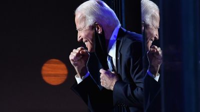 US President-elect Joe Biden gestures to the crowd after he delivered remarks in Wilmington, Delaware, on November 7, 2020. Democrat Joe Biden was declared winner of the US presidency November 7, defeating Donald Trump and ending an era that convulsed American politics, shocked the world and left the United States more divided than at any time in decades. Angela Weiss / AFP