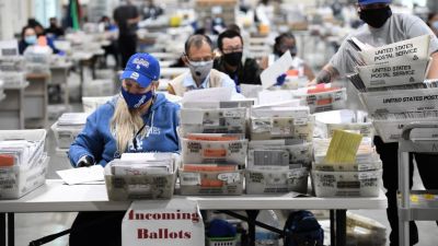 Mail-in ballots for the US presidential election are sorted at the Los Angeles County Registrar Recorders' mail-in ballot processing center at the Pomona Fairplex in Pomona, California, October 28, 2020. Robyn Beck / AFP
