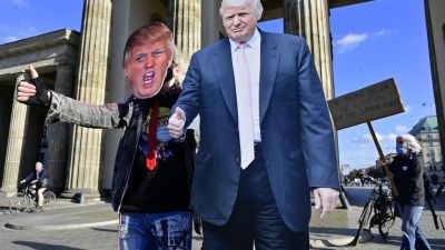 A supporter of US President Donald Trump poses with a cardboard cutout likeness of Trump in front of the Brandenburg Gate as a member of the "Democrats Abroad" organisation (R) walks displaying a placard urging that all ballots be counted, in Berlin on November 4, 2020, as counting continues in the current presidential election. The US election was plunged into chaos early Wednesday November 4, 2020, as President Donald Trump prematurely declared victory and sought Supreme Court intervention to stop vote-co