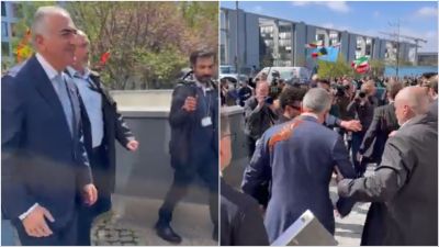 Footage was shared on social media showing Pahlavi walking in the street surrounded by guards when a man came from the back and threw red liquid on the political figure.