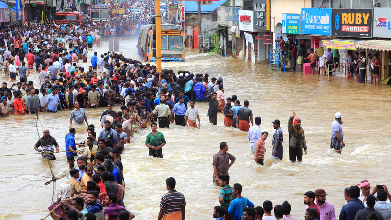 People gather to rescue the affected people from flooded area on August 17,2018 in Pathanamthitta,Kerala, India. Kerala was badly affected by the floods during monsoon. (Shutterstock)