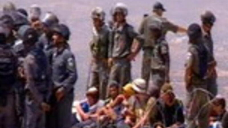 Soldiers wearing riot-gear in were hoisted atop an old British citadel in Sa Nur inside transport containers, attempting to remove the remaining die-hard settlers that had taken hold of the structure.